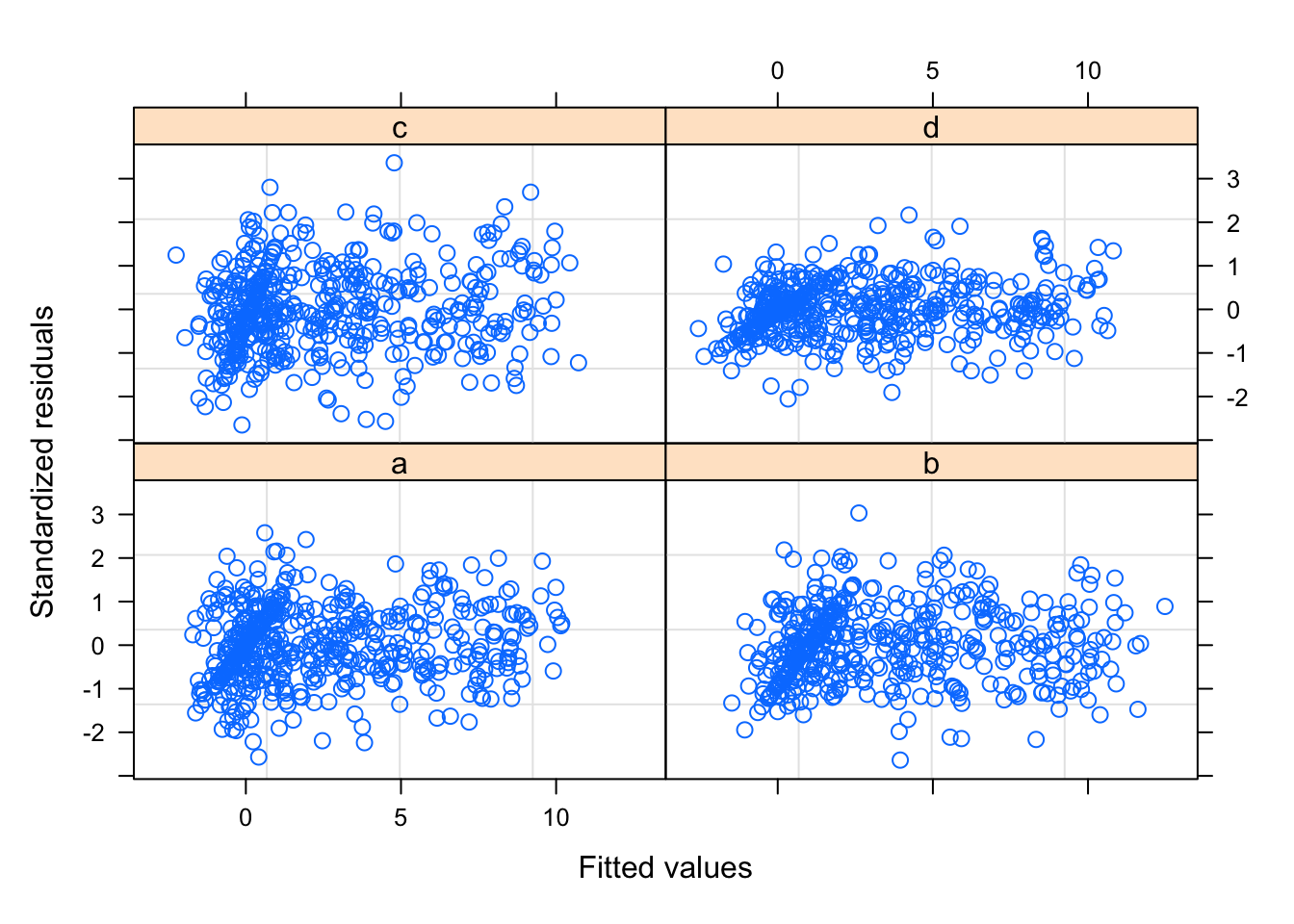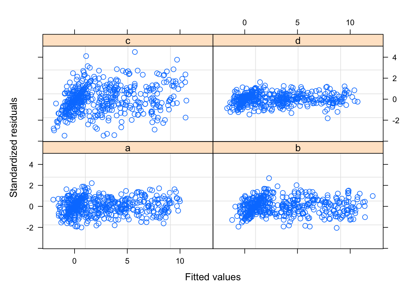The model does however assume identical residuals, regardless of scanner. We can produce a diagnostic plot showing the residuals by scanner, which shows that this assumption is not correct (as we already new). In particular, scanner d has much lower residuals than scanner c.